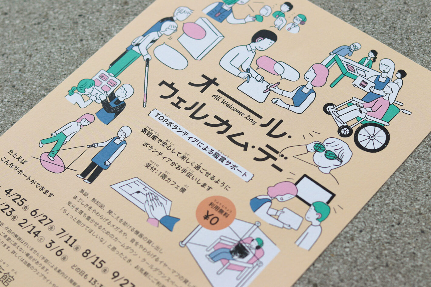 「オール・ウェルカム・デー」のキービジュアルには、さまざまな鑑賞方法を伝えるイラストを使用しました。鑑賞サポートの内容を具体的に表しつつ、受け取った人が美術館を訪れたくなるような表現を目指して、イラストレーターの須山奈津希さんにお願いしました。イラスト制作では、利用当事者からのフィードバックを丁寧に反映して仕上げていただきました。